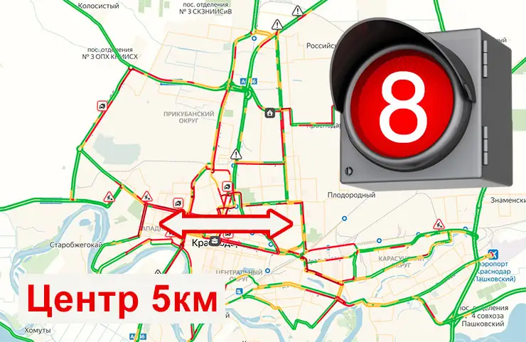 В час пик в Краснодаре пробки на восемь баллов. Городская застройка здесь более разрозненная, и в отличии от обоих столиц, никаких КАД в Краснодаре нет.