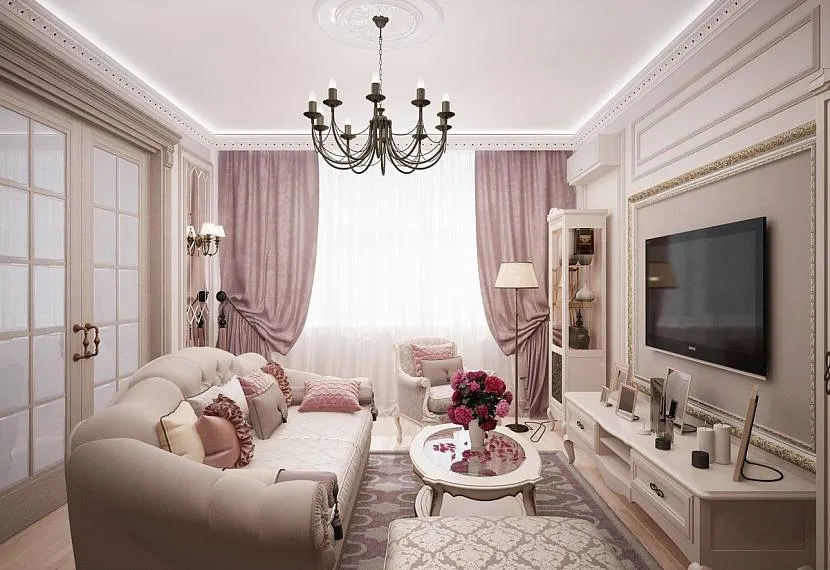 Идеальный классический вариант – комната жемчужно-серого дизайна, к которому подбирают декор пыльно-розового цвета: вазы, рамы, текстиль. Такой интерьер смотрится дорого, стильно. Зачастую достаточно всего одного яркого элемента.