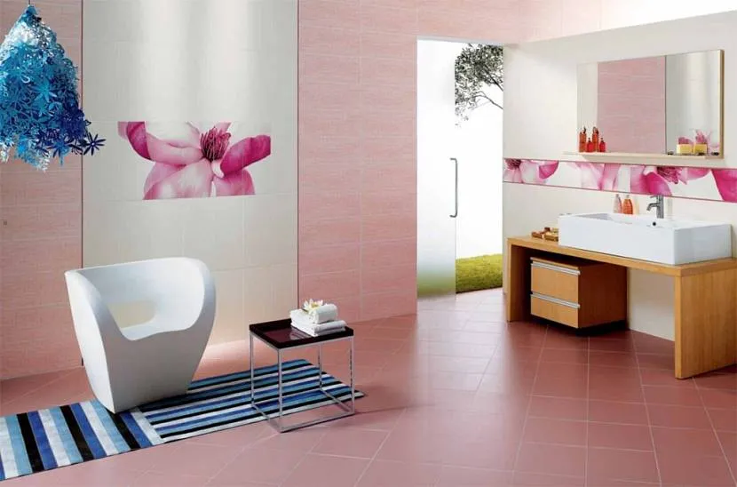 Пол цвета розы – весьма нестандартное решение, но ковролин такого оттенка может быть актуальным при обустройстве комнаты для девочки, спальни. Также в некоторых интерьерных стилях используют пол розово-белого цвета с имитацией мрамора. Для ванной комнаты может подойти грязно-розовая плитка в сочетании с белыми стенами и ярким декором.