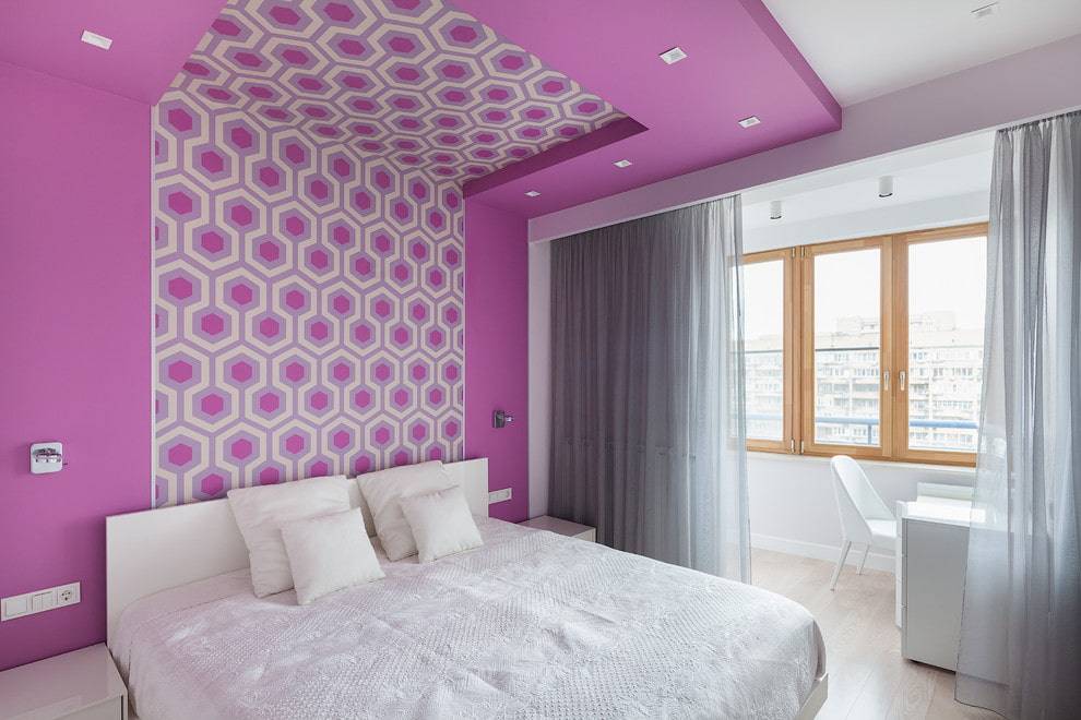 Бюджетным вариантом отделки считаются обои. Такое оформление привлекательно смотрится и отличается вариативностью. Можно поклеить на потолке монохромные розовые обои или с рисунком. Стены в этом случае лучше сделать серыми или белыми.