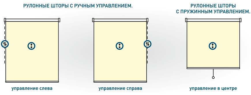 Ручное управление конструкцией, осуществляется при помощи пластиковой цепочки или шнура. Также существуют рулонные шторы с пружинной системой.