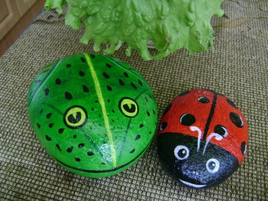 Гладкие камни могут стать «божьими коровками», которые можно разложить в разных углах сада, на пеньках и пр. Можно в глиняный горшок положить камешки, раскрашенные клубникой.
