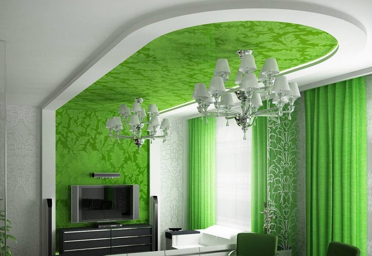 Еще один интересный вариант – комбинированный потолок с ярко-зеленой глянцевой основой и волнистыми гипсокартонными вставками. Лучше использовать его для широких помещений – так эффект будет выразительнее. Для можно применить точечные светильники или несколько плоских люстр.