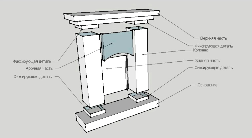 Снаружи сооружение состоит из облицовки и портала. Портал представляет собой оформление и декор камина, а облицовка – это окончательная отделка сооружения.