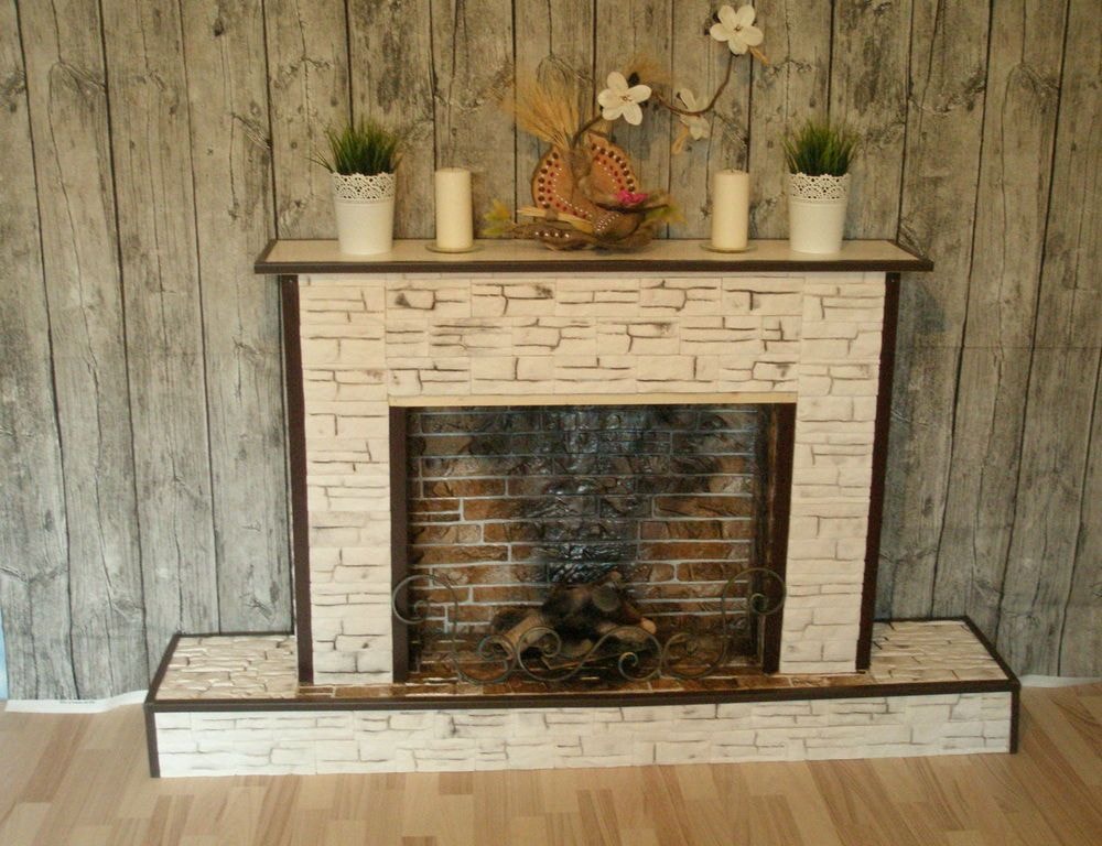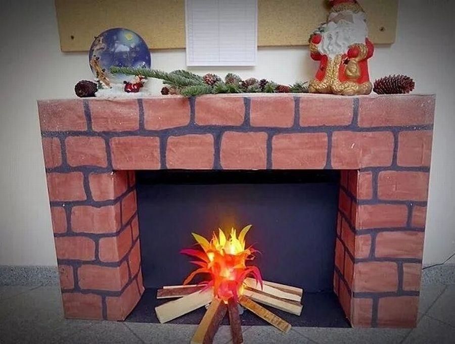 Правдоподобное бутафорское пламя выполняется из цветной бумаги, ткани, закрепленной над вентилятором, светодиодной подсветки красно-оранжевого колера. Сами дровишки также склеивают из бумаги, раскрашивают вручную (при помощи черной и белой краски можно имитировать березовые поленья). Если картон плотный, гофрированный, его украшают гипсовыми кирпичиками, отлитыми собственноручно. Готовое сооружение окрашивают красно-коричневым или белым, прорисовывают стыки между деталями.