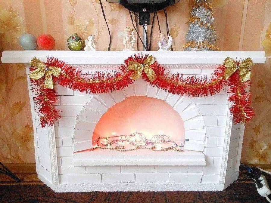 Весело и празднично смотрится такой камин. И есть – почему. Кроме гирлянды здесь очень по теме имеется светодиодная гирлянда, которая подсвечивает белизну камина и его “кирпичную” кладку, которая смотрится как у настоящего камина. Хотя материал при его изготовлении использован достаточно легкий – картонные коробки.
