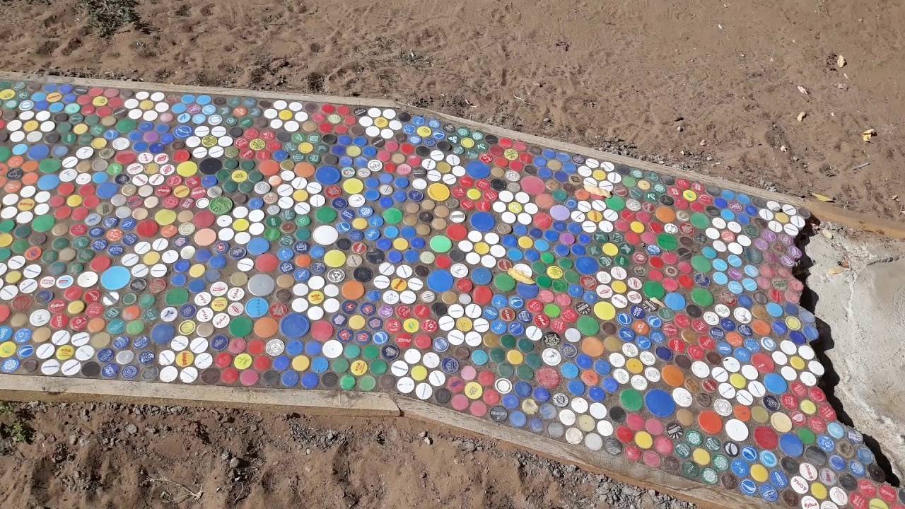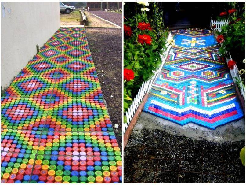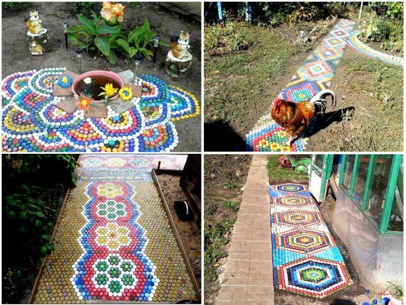 Своими руками выложить тропинки на даче можно из целых бутылок, из донышек, а можно из пластиковых крышек. За счет такого подручного материала можно получить оригинальные мозаичные дорожки.