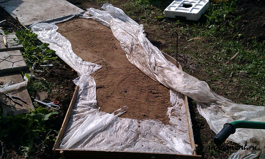 Рис.6. Слой песка составляет примерно 10 см. Остатки агроволокна можно загнуть на верх подушки. Перед началом заливки ее следует хорошо уплотнить. Самый простой способ это обильно пролить водой.