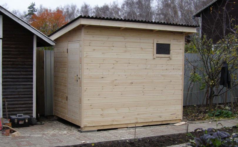 Несущую конструкцию каркасного хозблока собирают из бруса. Затем, в зависимости от назначения бытовки, обшивают доской или ОСП с последующей внутренней и внешней отделкой (при необходимости).