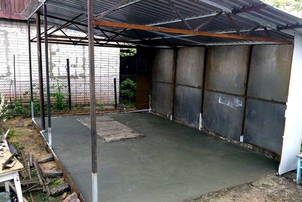 Был построен каркасный сарай размером 6*3 метра. Крыша односкатная, крыта ондулином. Высота передней стены 3 метра, задней — 2,4 м. Эксплуатация показала, что при таком перепаде высот снега много не скапливается (Лен. область).