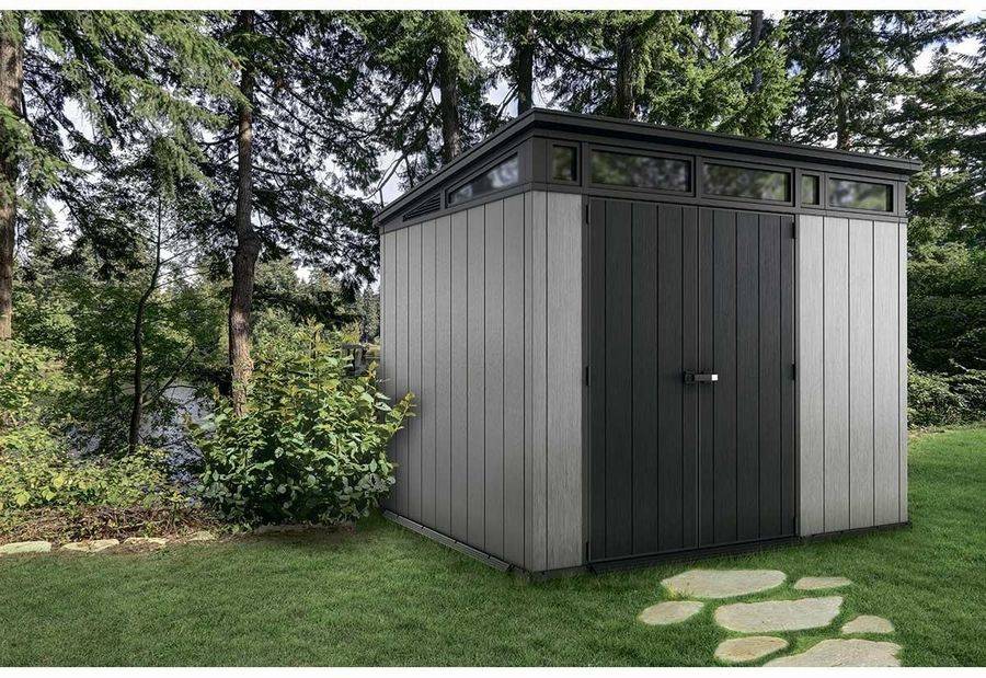 Встречаются и хозблоки с двускатной крышей. Решение помогает организовать места для хранения в пространстве наверху. Остекление хозблока — частое решение. Пассивное освещение — важная вещь.