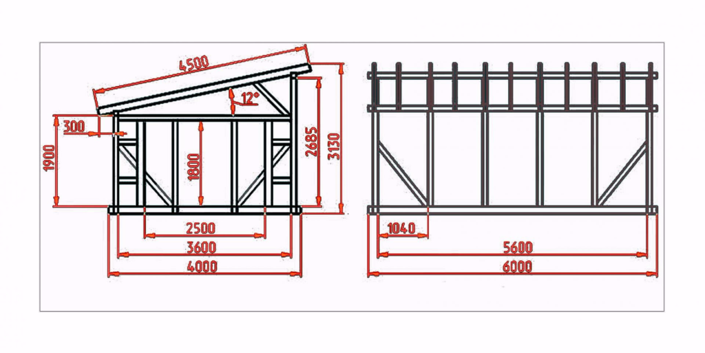 - укрепляют вертикальные брусья при помощи временных откосов, при этом стойки фронтальной стены должны быть выше, чтобы обеспечить скат крыши в среднем 17 градусов;
