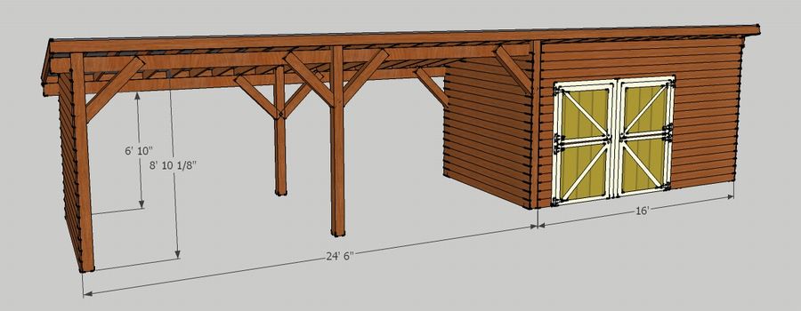 Навес можно продлить настолько, что сам навес будет по длине превосходить сам хозблок, но тогда следует возвести стену в конце навеса от ветра и снега.