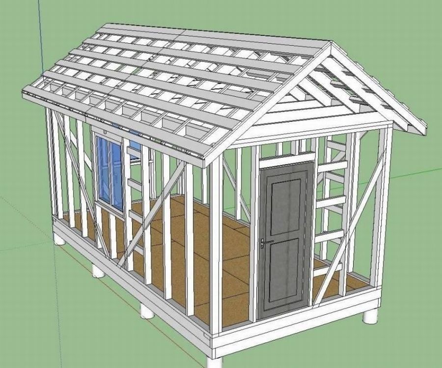 Обшивка, кстати, не обязательно должна быть из фанеры или ОСП. Можно вагонку или доску крепить сразу а стойки. Но тогда при сборке каркаса нужно ставить укосы: без жесткости плитного материала постройка будет хлипкой. Если укосы не ставить, качнуть можно рукой.
