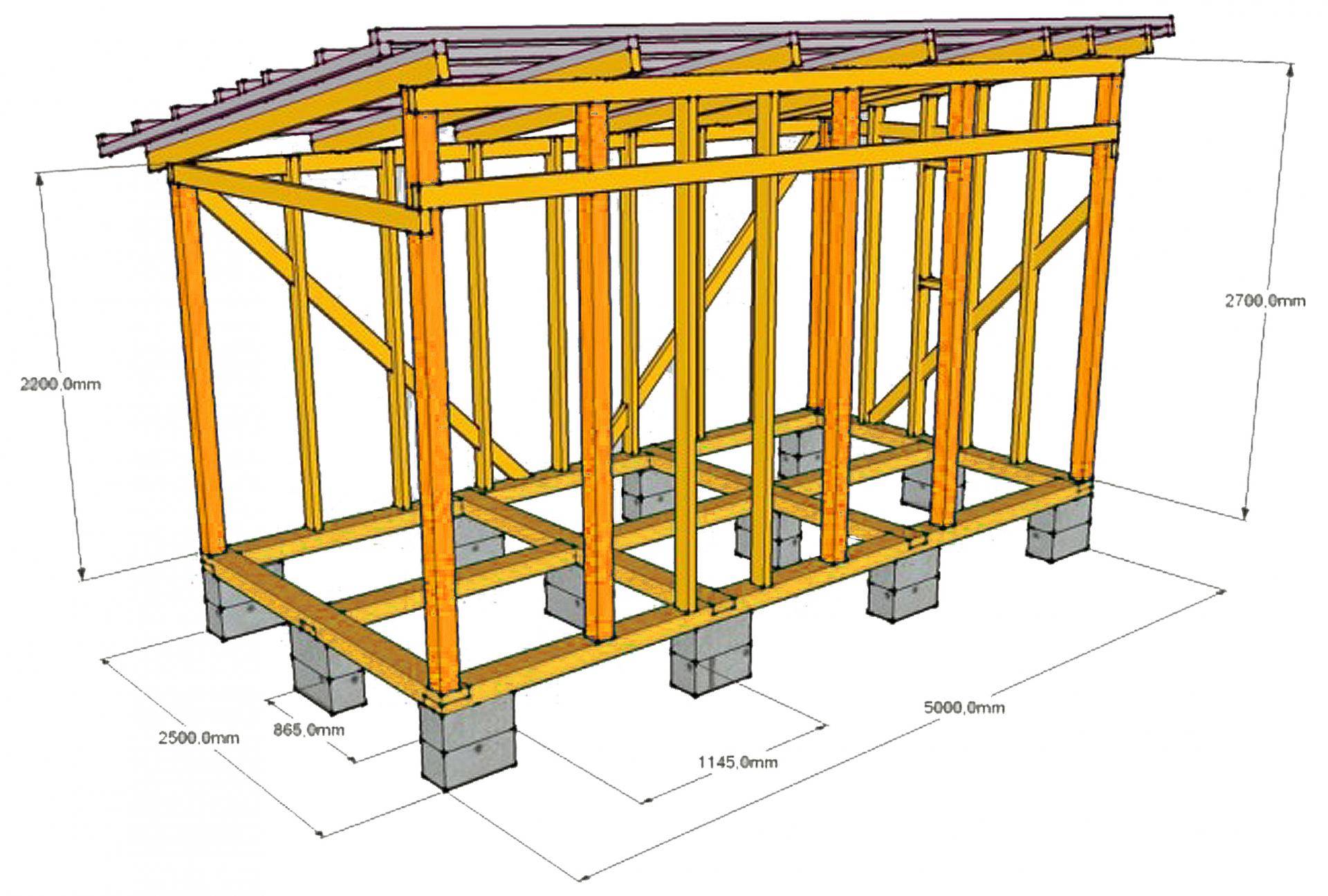 - укрепляют вертикальные брусья при помощи временных откосов, при этом стойки фронтальной стены должны быть выше, чтобы обеспечить скат крыши в среднем 17 градусов;