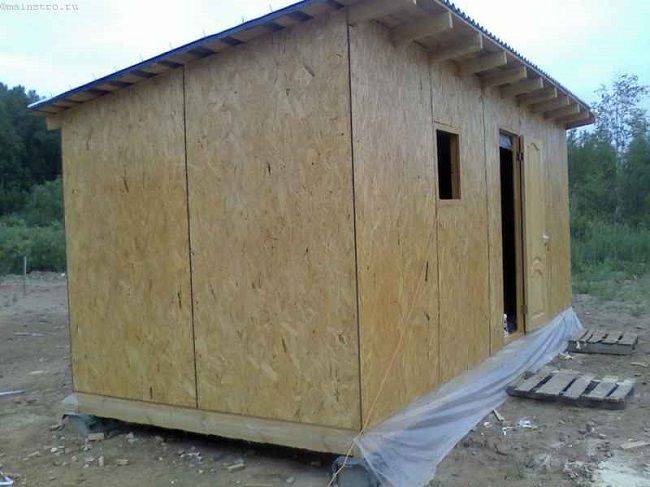 Обшивка, кстати, не обязательно должна быть из фанеры или ОСП. Можно вагонку или доску крепить сразу а стойки. Но тогда при сборке каркаса нужно ставить укосы: без жесткости плитного материала постройка будет хлипкой. Если укосы не ставить, качнуть можно рукой.