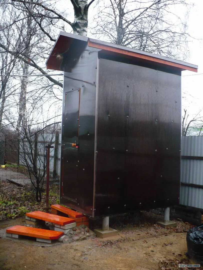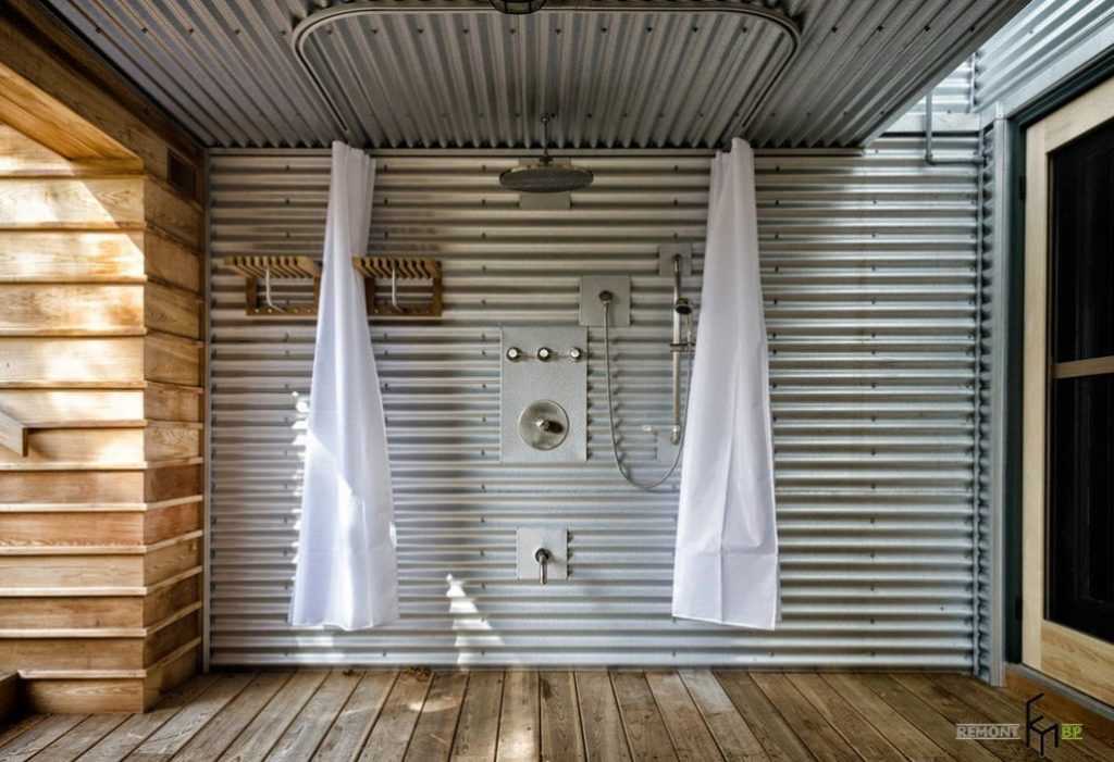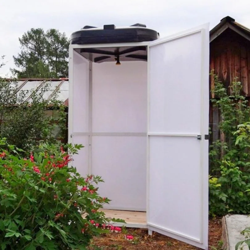 Еще одним интересным решением будет комбинирование. Например, три стены можно сделать из жесткого материала, зашив деревом или листом метала, или поликарбоната, а четвертая стенка может представлять собой ширму из непрозрачной пленки. К сожалению, на такую конструкцию погрузить бак для воды не получится, и поэтому воду можно пустить из домашнего водопровода.
