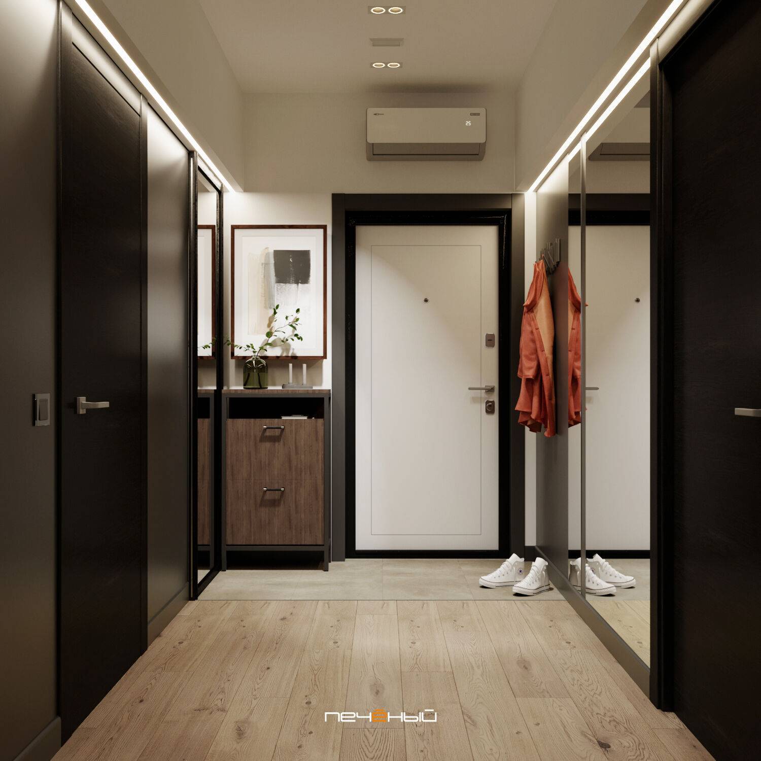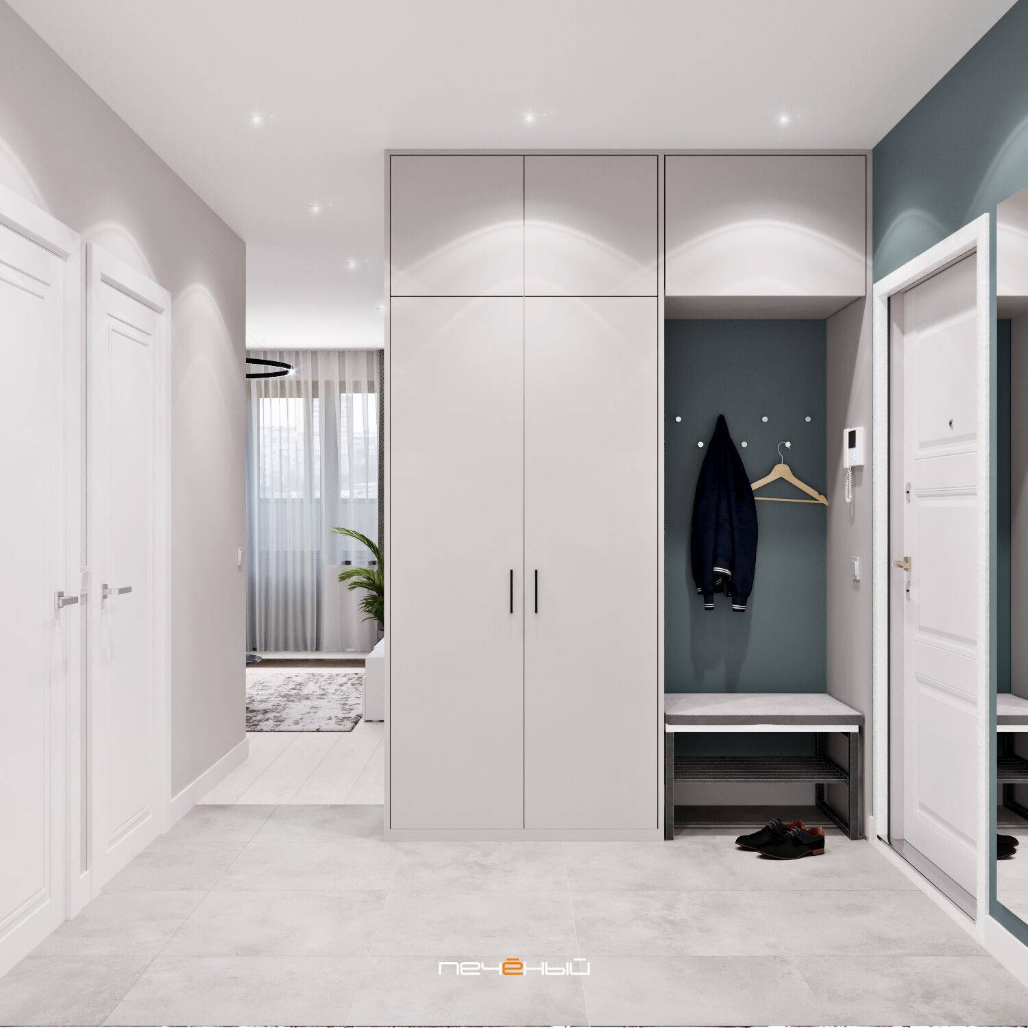 Если прихожая неоправданно длинная, вполне можно подумать о том, чтобы ее дальнюю часть обустроить как кладовую комнату или гардеробную. Возможно, сейчас ваша прихожая выглядит иначе, но в нескольких типовых планировках стоит совсем немного безболезненно во время ремонта передвинуть дверной проем в жилую комнату, и вы получите открытое помещение гораздо более приближенных к квадрату размеров, а также закрытую его часть, где можно хранить огромное количество нужных вещей — начиная от верхней одежды и заканчивая бытовыми приборами.