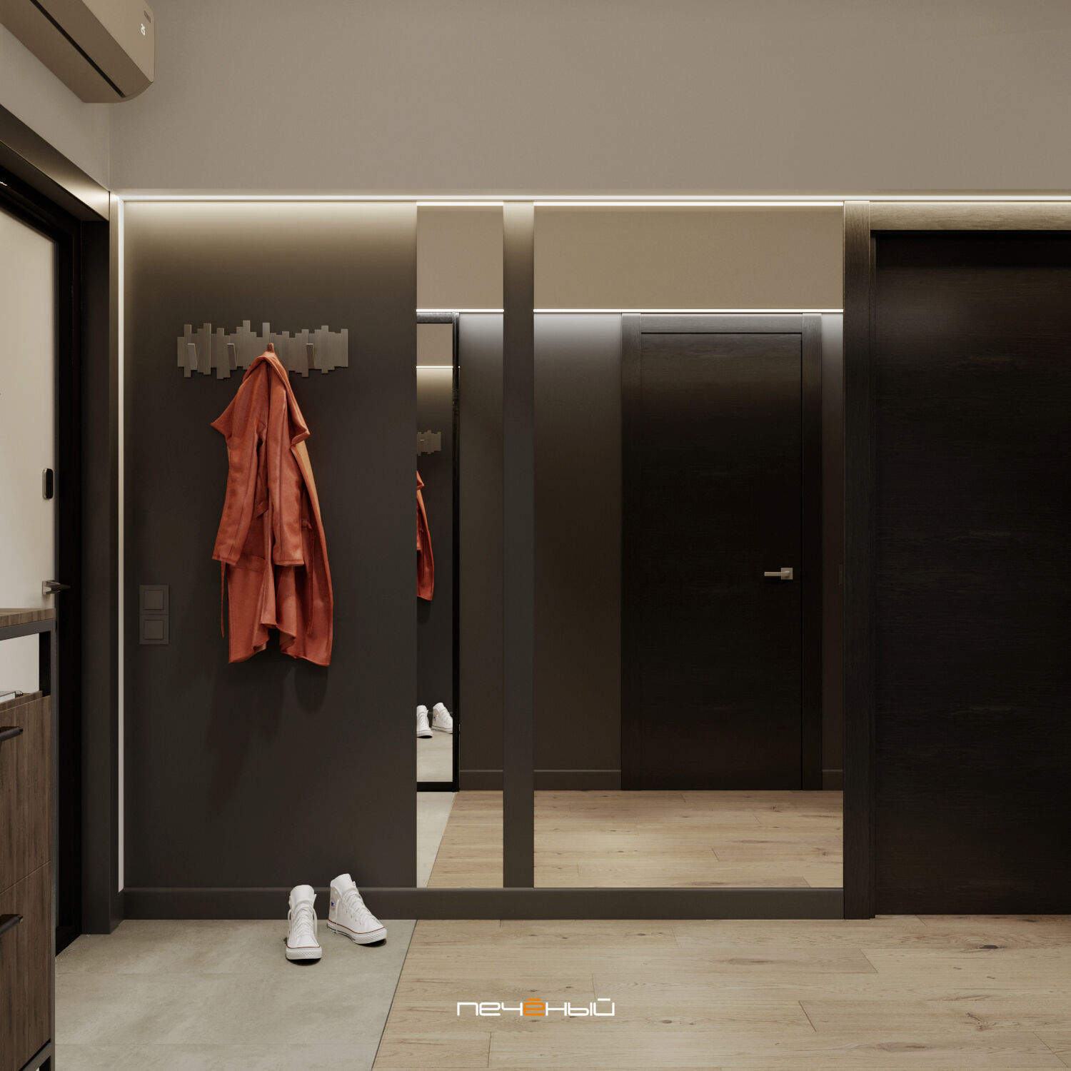Интерьер не для всех. Черные фасады, подсветка, зеркала — очень стильно, но такой дизайн прихожей подойдёт, конечно, далеко не каждому.
