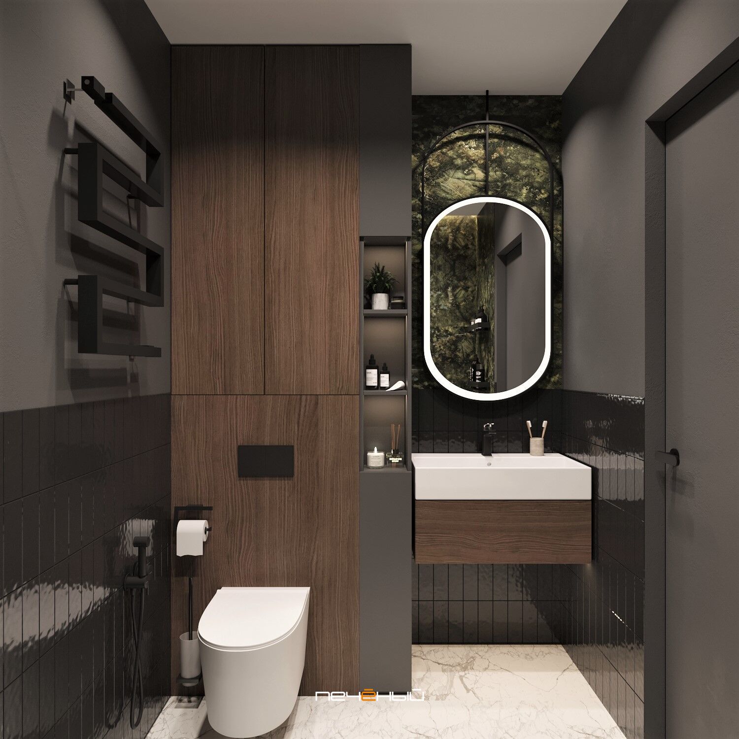 Преимущество стоит отдать формам геометрического плана, использованию не одного, а сразу нескольких зеркал, однотонным панелям, перетягивающим внимание на себя. В минималистическом дизайне акцент направлен на угловые части помещения