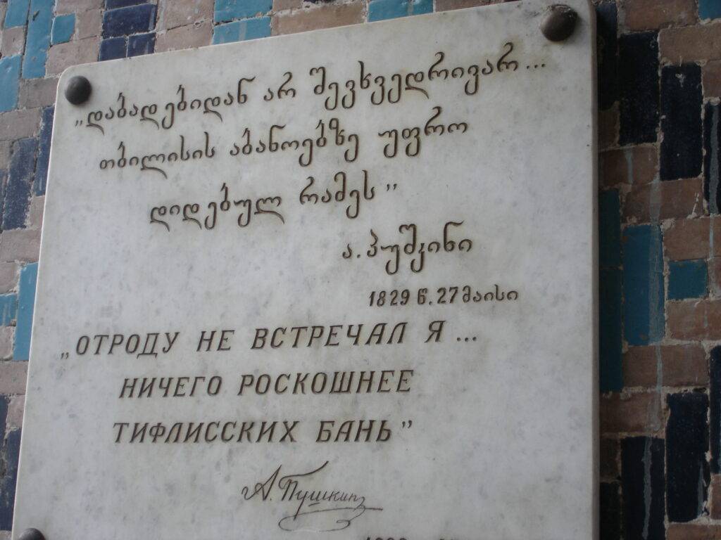 Вход в здание украшен табличкой с высеченными словами великого русского поэта А.С. Пушкина. По легенде, он посетил это заведение во время путешествия по Грузии и произнес фразу: «Отроду не встречал я ничего роскошней тифлисских бань».