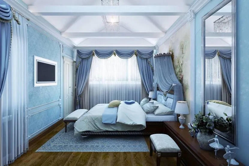 В качестве штор уместно применение тканей с различными фактурами, которые в зависимости от освещения способны изменять цвет. Для роскошной и богатой атмосферы, окно в голубой спальне украшают полотнами с ламбрекенами или пышными драпировками, по тону сочетающимися с балдахином над кроватью. В создании спокойного и лаконичного дизайна подбирают прямые портьеры на люверсах или белоснежные тюлевые гардины.