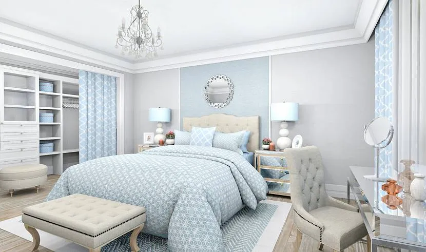 Пастельные голубые полотна отлично оттенят текстиль и аксессуары спальни