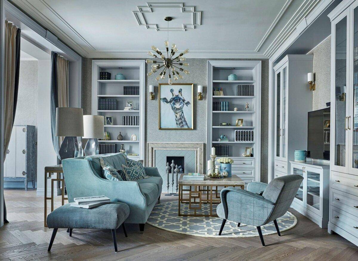 Такой интерьер смотрится расслабляющее и умиротворённо. Глубокий синий цвет хорошо подходит для обивки мягкой мебели, текстильного декора, штор. Если комната не слишком просторная, стены лучше сделать светло-серыми, используя краску или штукатурку. С серо-синей гаммой хорошо сочетается серебряный цвет, а также керамогранитная плитка под камень.