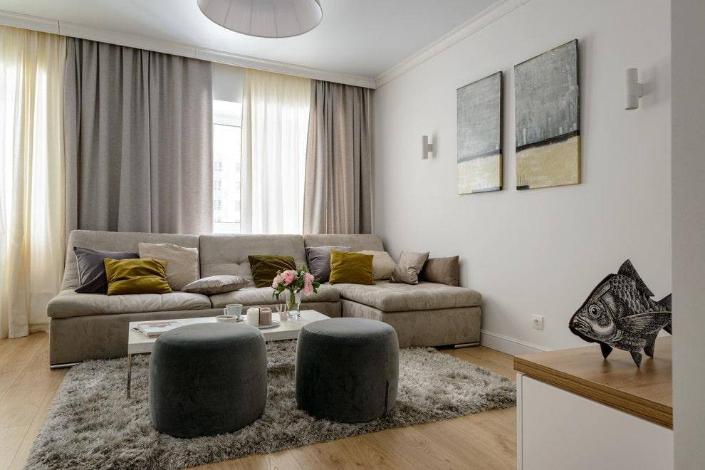 Интерьер гостиной в серо-бежевых тонах сочетает элегантность и уют. Такая цветовая гамма подходит как классике, так и или контемпорари. Если гостиная имеет небольшую площадь, лучше взять в качестве основного цвета беж, а в просторном помещении можно сделать доминирующим серый. С тёплыми серыми тонами хорошо сочетаются песочные и пудровые оттенки.