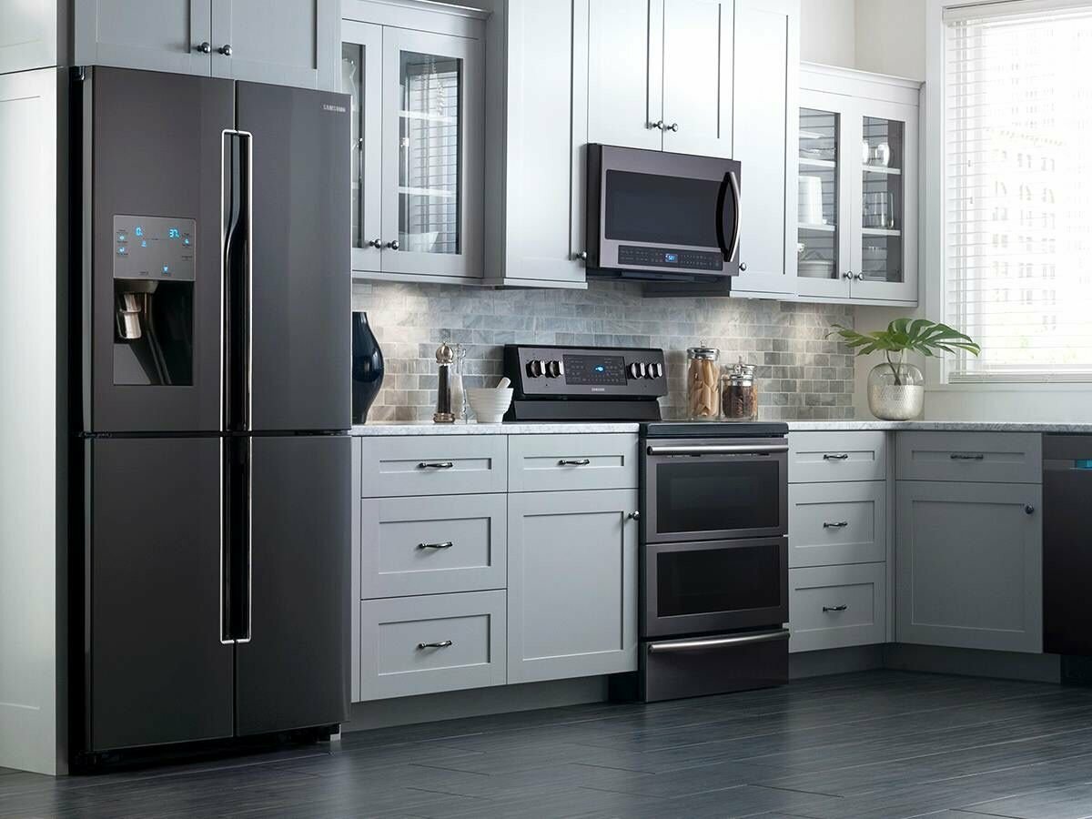 Чёрная техника создаст красивый контраст, но её лучше устанавливать в просторных помещениях. Особенно, это касается чёрных холодильников.