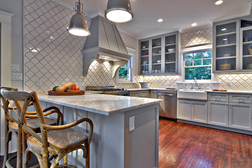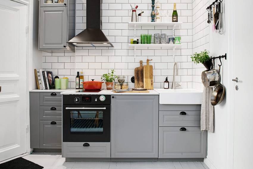 Что касается фартучной зоны, то, как правило, под светло-сероватый цвет подходит белоснежная плитка. Для создания акцента на «фартуке» можно включить яркий оттенок, который гармонирует с базовым серым.