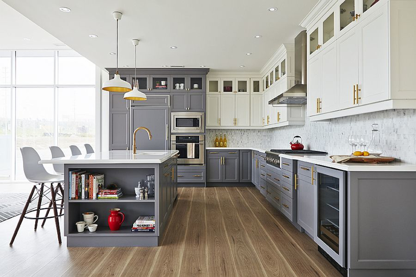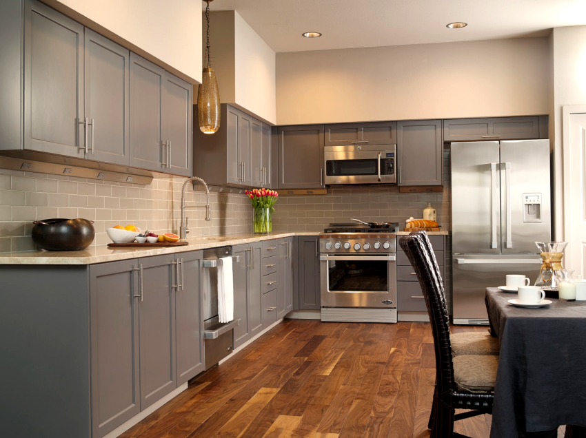 Использование серого цвета просматривается в различных материалах. Один из ведущих трендов в оформлении кухонных помещений – шкафчики из древесины серого цвета