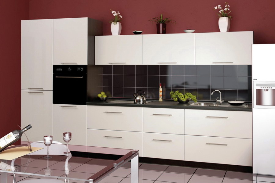 Например, мебель и рабочие поверхности будут темно-серого цвета, кафель будет в черно-белом исполнении, а большой кухонный стол будет насыщенного малинового цвета. Конечно, такой дизайн не всем придется по душе, но он гарантированно будет смотреться свежо и необычно.