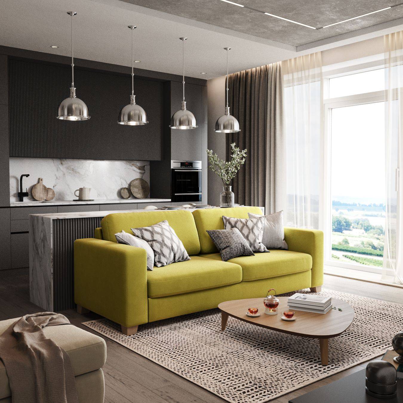 В случае кухонь-гостиных набор мебели также можно дополнить диваном, сервантом, если это вписывается в дизайнерскую концепцию интерьера.