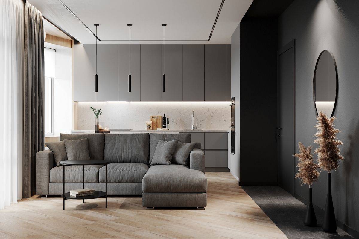Если есть цель — создать монохромный интерьер, то на фоне серых стен лучше поставить мебель, оформленную тоже в сером, но более светлом оттенке.
