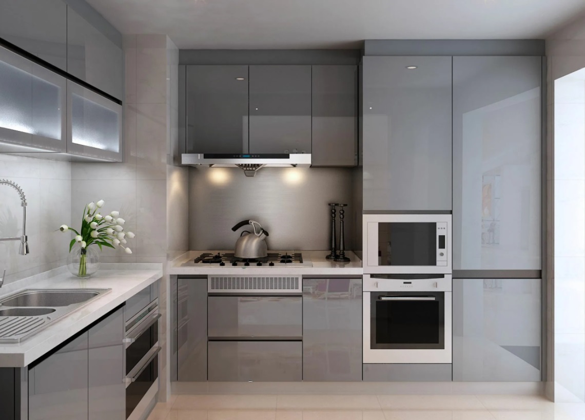 Белая техника — отличное решение для небольших кухонь со светло-серым гарнитуром.