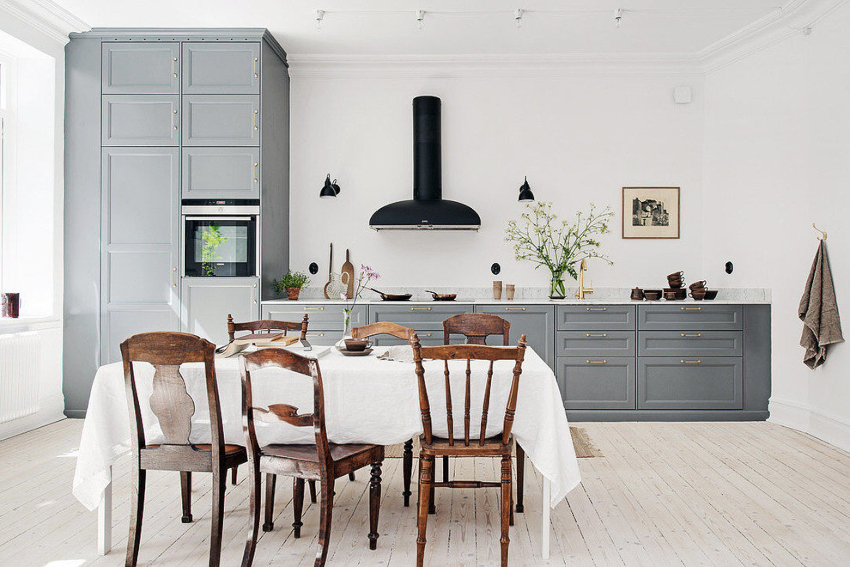 Зачастую сероватые кухонные фасады в светлом исполнении комбинируют с белоснежными стеновыми поверхностями. Такое сочетание легко впишется в классицизм и стилистическую современность.