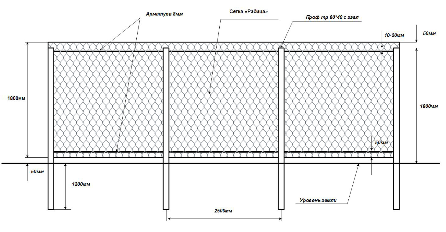 Другой вариант даёт чуть более изящный результат. Из стального уголка 20 мм свариваются квадраты размером 1,9×1,9 м², на них натягивается сетка. Каждый такой квадрат крепится на кронштейнах между двумя столбами.