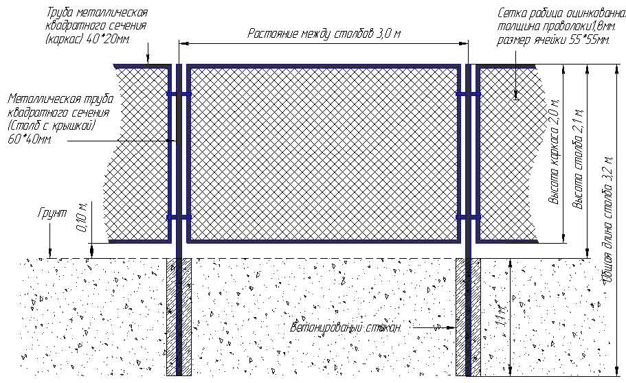 Расстояние между стойками должно быть одинаковым. Оно складывается из нескольких величин: ширина секции сетки и ширина опоры.