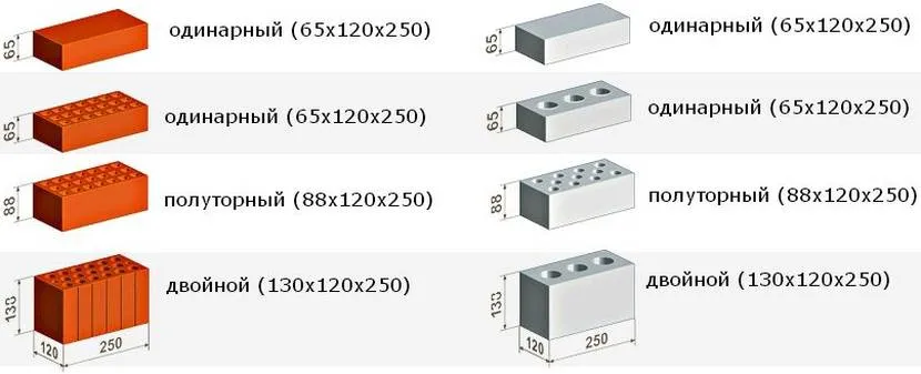 - Размерам: стандартный белый (одинарный) кирпич — 250х120х65 мм, полуторный — 250х120х88 и двойной 250×120×138. Для укладки оснований домов чаще всего применяют последний (он удобнее других в работе).