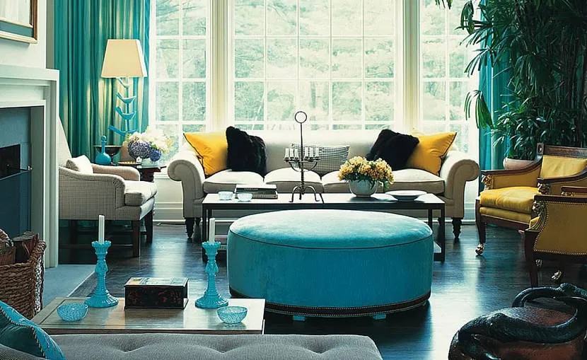 Оригинально смотрится на фоне светло-голубых или бирюзовых стен ярко-синяя мебель. Уравновесить интерьер поможет ковер, вазы или напольные статуэтки аналогичного цвета. Смелое, но изысканное решение — аквамариновые и бирюзовые кресла. Добавит нотку уюта и тепла в синюю гостиную также коричневая, зеленая, белая или оранжевая мебель: диван, журнальный столик, торшеры, пуфики и пр.