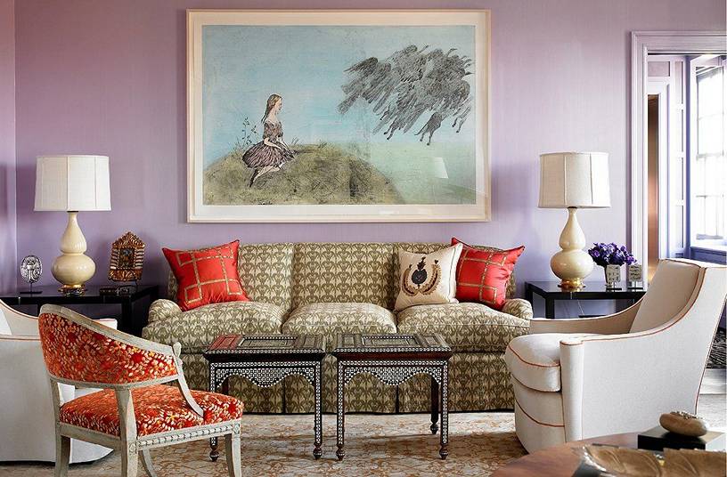 Яркие акценты (ткани, ковры, декоративные подушки) насыщенных розовых оттенков (фуксия, малина) дополнят интерьер гостиной с сиреневыми обоями. Аксессуары более глубоких цветов целесообразно сочетать со светлым и мягким фоном, а пастельные — с темным.