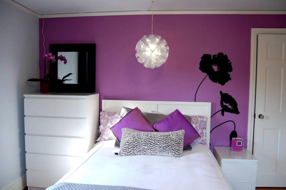 При выборе отделки дизайнеры рекомендуют обратить внимание на стильные жемчужные цвета с фиолетовым отливом, нежные оттенки орхидеи, фуксии, лаванды. Самыми темными из допустимых для спальни считаются аметист или гелиотроп. Лиловые с розоватым отливом обои в комнате для отдыха будут прекрасно смотреться на фоне коричневой мебели или аксессуаров бордового колера
