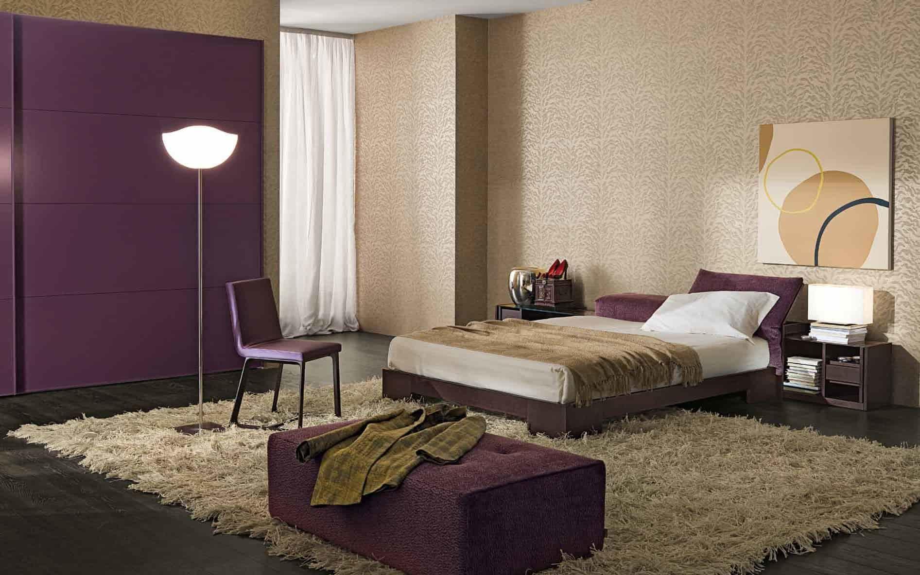 При выборе отделки дизайнеры рекомендуют обратить внимание на стильные жемчужные цвета с фиолетовым отливом, нежные оттенки орхидеи, фуксии, лаванды. Самыми темными из допустимых для спальни считаются аметист или гелиотроп. Лиловые с розоватым отливом обои в комнате для отдыха будут прекрасно смотреться на фоне коричневой мебели или аксессуаров бордового колера