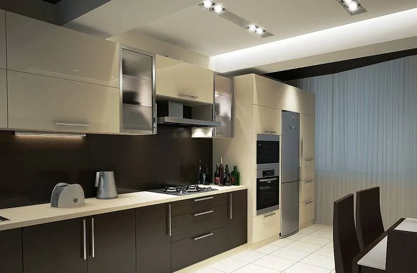 Наличие в таком помещении шкафа-купе позволит спрятать в его внутренней части различную кухонную утварь или бытовую технику. Самыми удачными вариантами для таких интерьеров являются встроенные или полувстроенные модели.