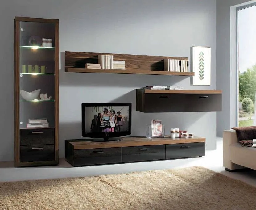 Для гостиной рекомендуется подбирать практичные шкафы, оснащенные системами стеллажей.