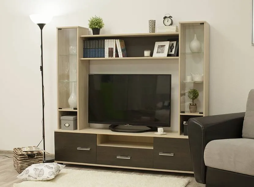 Выбирая консоль для телевизора или стенку с множеством полок и ящиков, учтите: на поверхности отлично видна пыль и вытирать ее придется 2-3 раза в неделю. Поэтому предпочтение лучше отдать закрытым системам хранения.