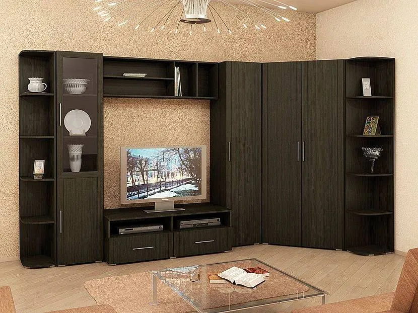 С залом правила те же: в большом вся обстановка может быть в темном дереве, в маленьком — лишь небольшие детали в оттенке венге.