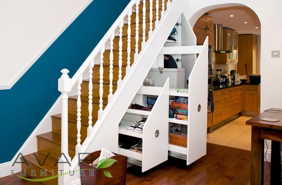 Пространство под лестницей можно разумно использовать, переоборудовав ступени под ящики, снабдив их надежными направляющими механизмами и ручками. При невозможности организации хранилища внутри ступенек стоит рассмотреть возможность занятия под обувную кладовую места в подлестничном пространстве.