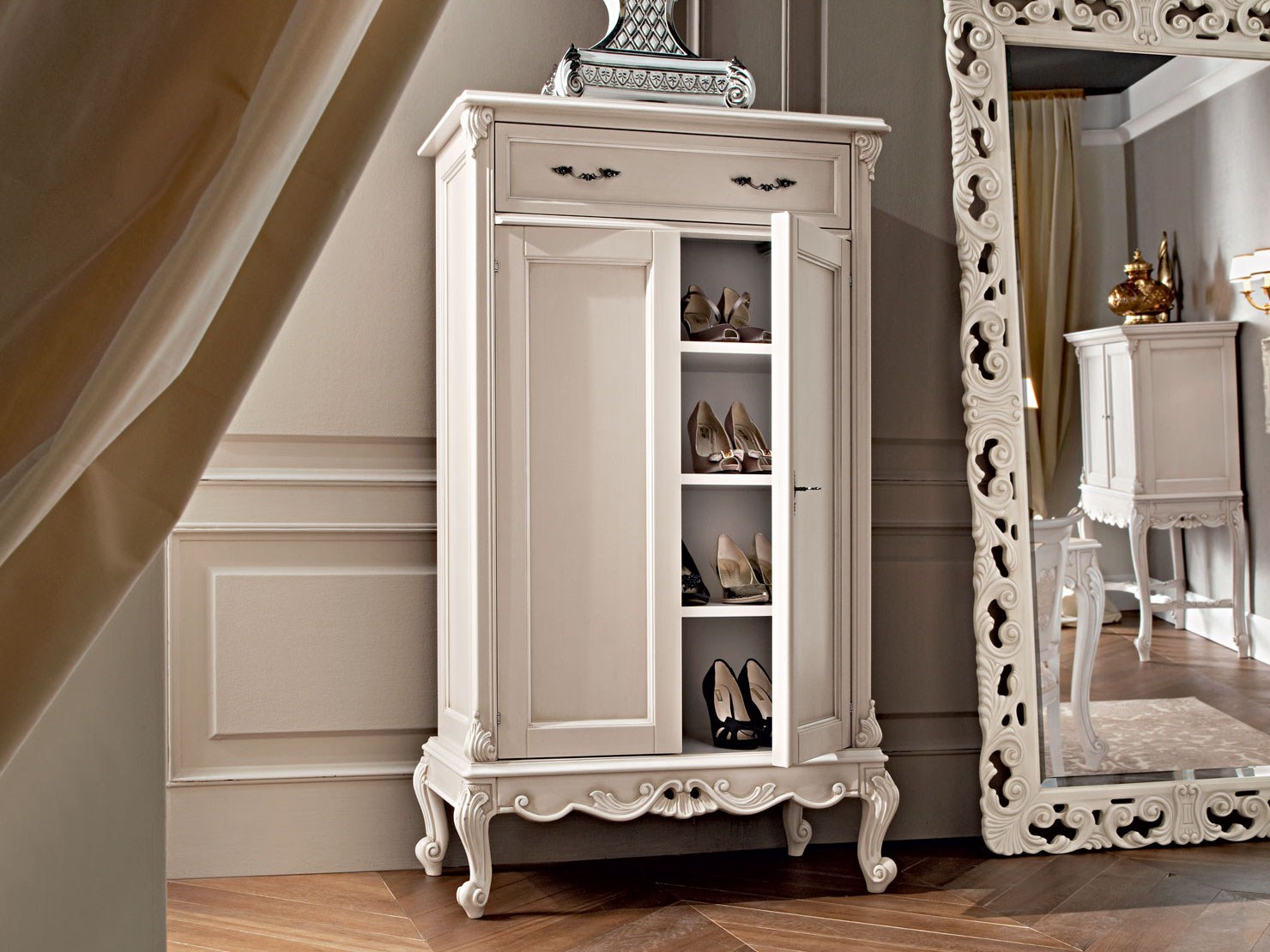 бона – это тумба с полками, закрывающаяся вертикально расположенными дверцами или без них. Полки могут быть как глухими, так и решетчатыми. К преимуществам такой конструкции относят отсутствие деформации обуви и хорошую вентиляцию. Такая модель может быть довольно вместительной. За счет различной высоты полок доступно хранение разнообразной обуви, а глубина шкафа рассчитана на пару самого большого размера. Обычно высота подобного шкафа около 1 метра, однако мебель, выполненная на заказ, может быть и под потолок;